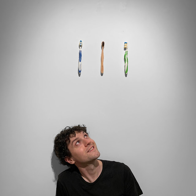 Here's a photo of me with some new glazed ceramic sculptures of toothbrushes, titled Old Mates.